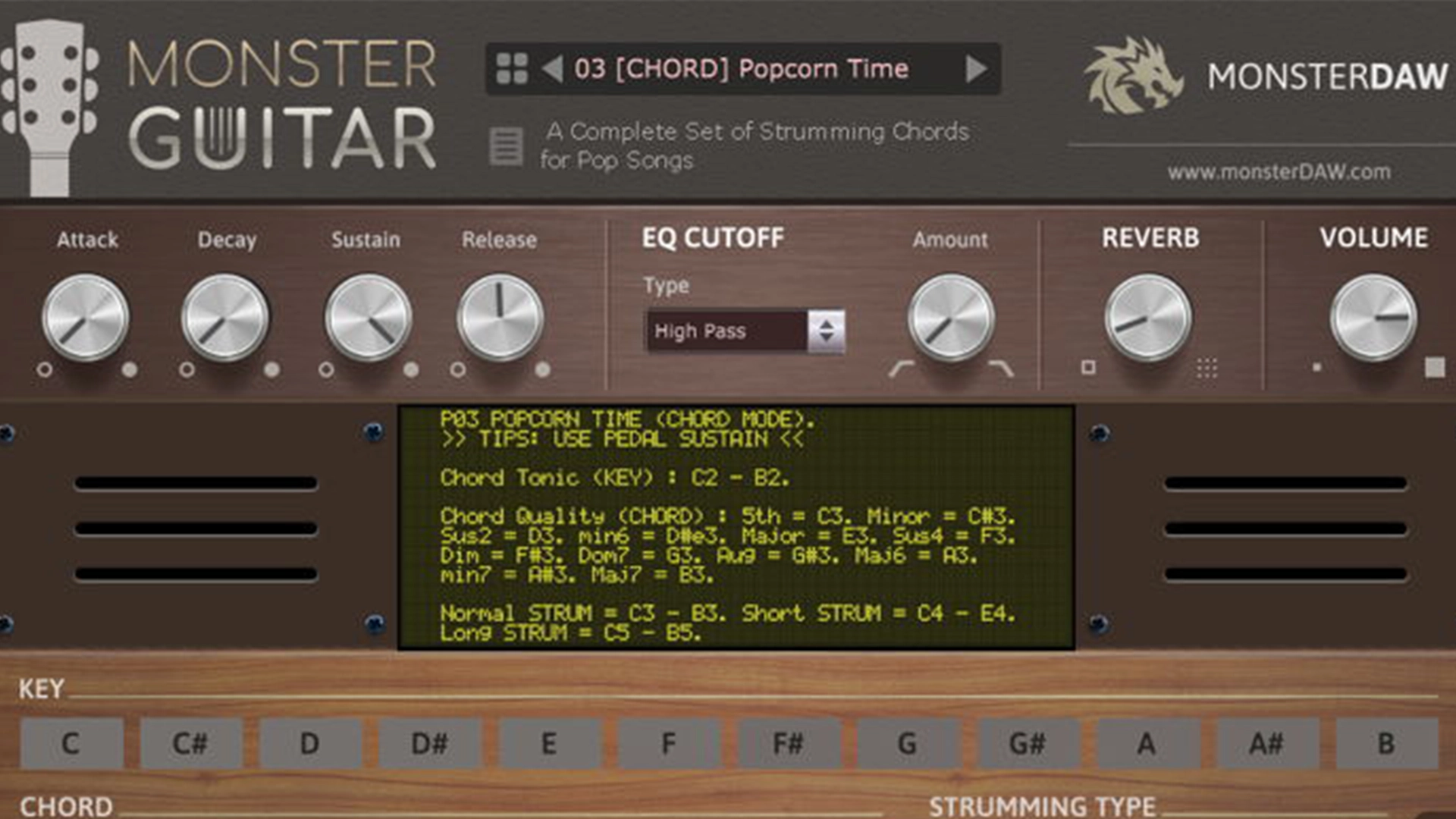 The plugin is lightweight and does not require much computer power, so it works smoothly even on older systems. Monster Guitar includes essential controls for adjusting the sound, like volume, reverb, and envelope settings, allowing users to shape the guitar tone to fit perfectly in their mix.