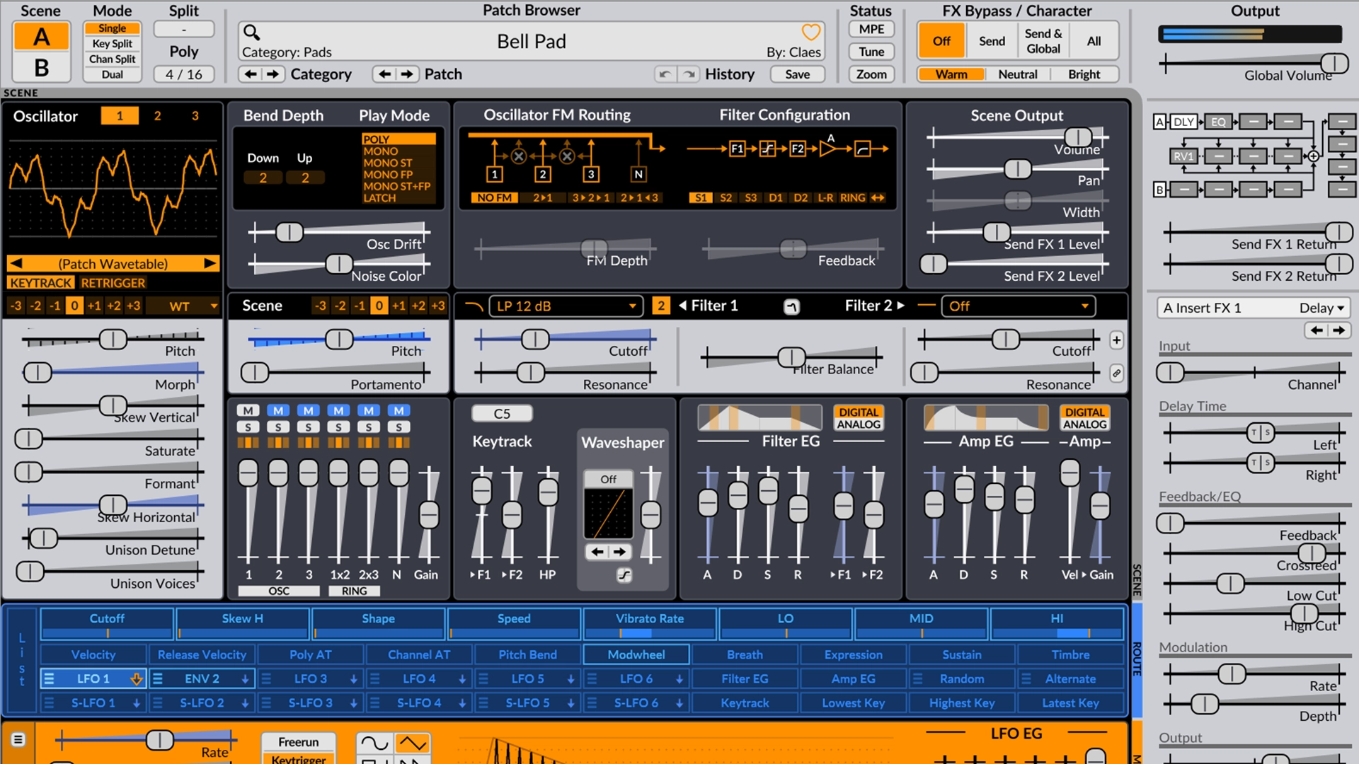 At its core, Surge XT features three oscillators per scene, each with 12 different algorithms, including classic, modern, wavetable, FM2, FM3, and more. Most algorithms support up to 16-voice unison, allowing for rich, layered sounds. The dual filter blocks offer eight configurations and a wide selection of filter types, including lowpass, highpass, bandpass, notch, and more, all capable of self-oscillation and rapid response to modulation. The modulation system is extremely flexible, with up to 12 LFOs (six per voice, six global), DAHDSR envelopes, and the ability to modulate nearly any parameter for complex, evolving patches.